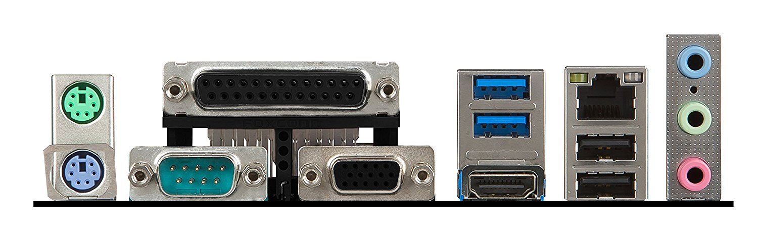 1 x PS/2 keyboard port- 1 x PS/2 mouse port- 2 x USB 2.0 ports- 2 x USB 3.1 Gen1 ports- 1 x Serial port- 1 x Parallel port- 1 x VGA port- 1 x HDMI™ port- 1 x LAN (RJ45) port- 3 x audio jacks |